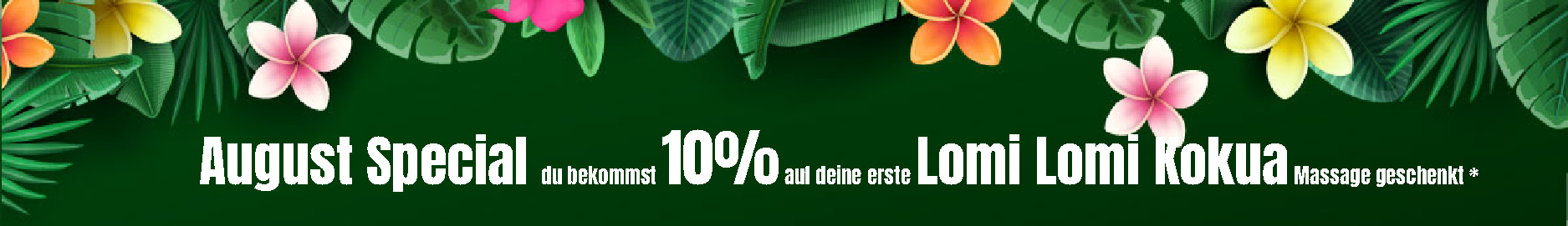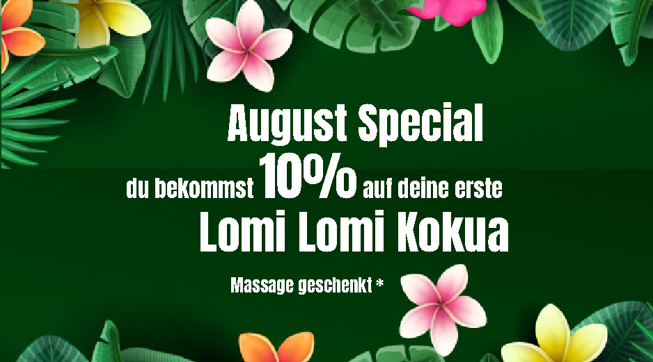 *Ich schenke dir 10% auf deine erste Lomi Lomi Kokua Massage bei mir. Der Gutschein ist einmalig einlösbar, nicht übertragbar, nicht auszahlbar und nicht mit anderen Aktionen kombinierbar. Der Gutschein gilt bis zum 26. August für eine Lomi Lomi Kokua Massage, nicht für ein Aloha-Paket.